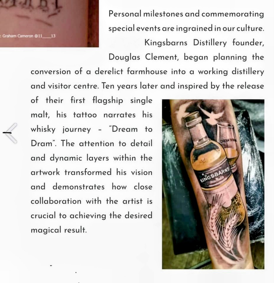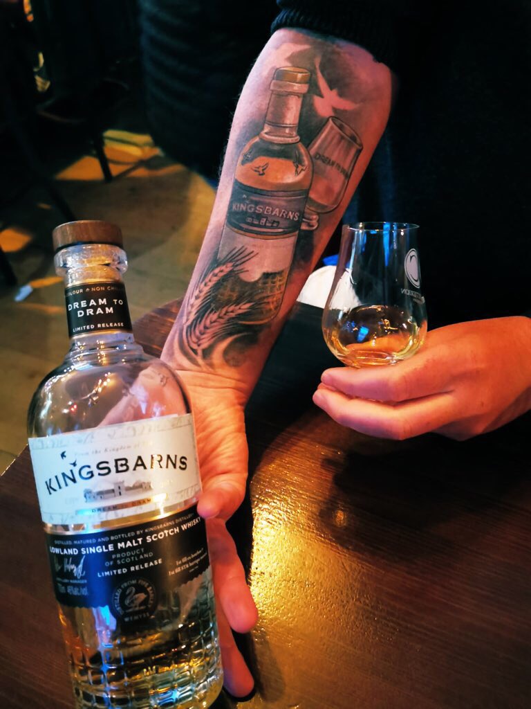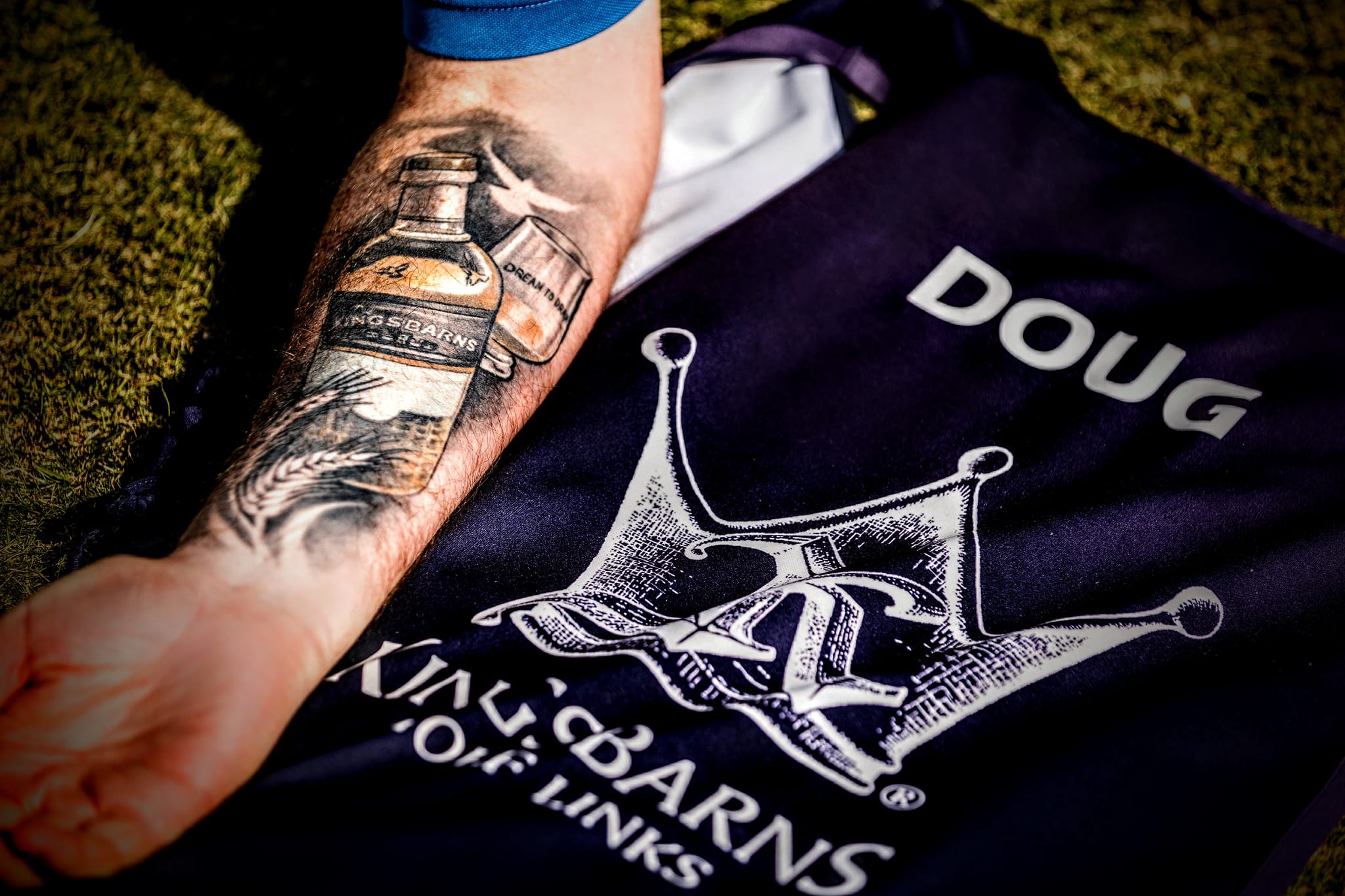 The phrase “Dream to Dram” was conjured up by Jamie Jauncey (the writer Wemyss hired to help with the Kingsbarns brand) in the summer of 2014 just before the distillery opened to describe my journey from golf caddie to distillery founder. So you can imagine how amazing it felt to see this phrase as the first thing that visitors saw in the distillery exhibition at the start of their tour and in a lot of the branding literature. The media seemed to like the phrase too. However for me the ultimate honour was when the first flagship Kingsbarns whisky was named Dream to Dram (now sadly discontinued and replaced by Doocot). To celebrate this I got my first tattoo with Dram to Dram written onto the Glencairn Glass next to the Kingsbarns bottle which made the headlines in the Scotsman newspaper and Whisky Explorer Magazine.