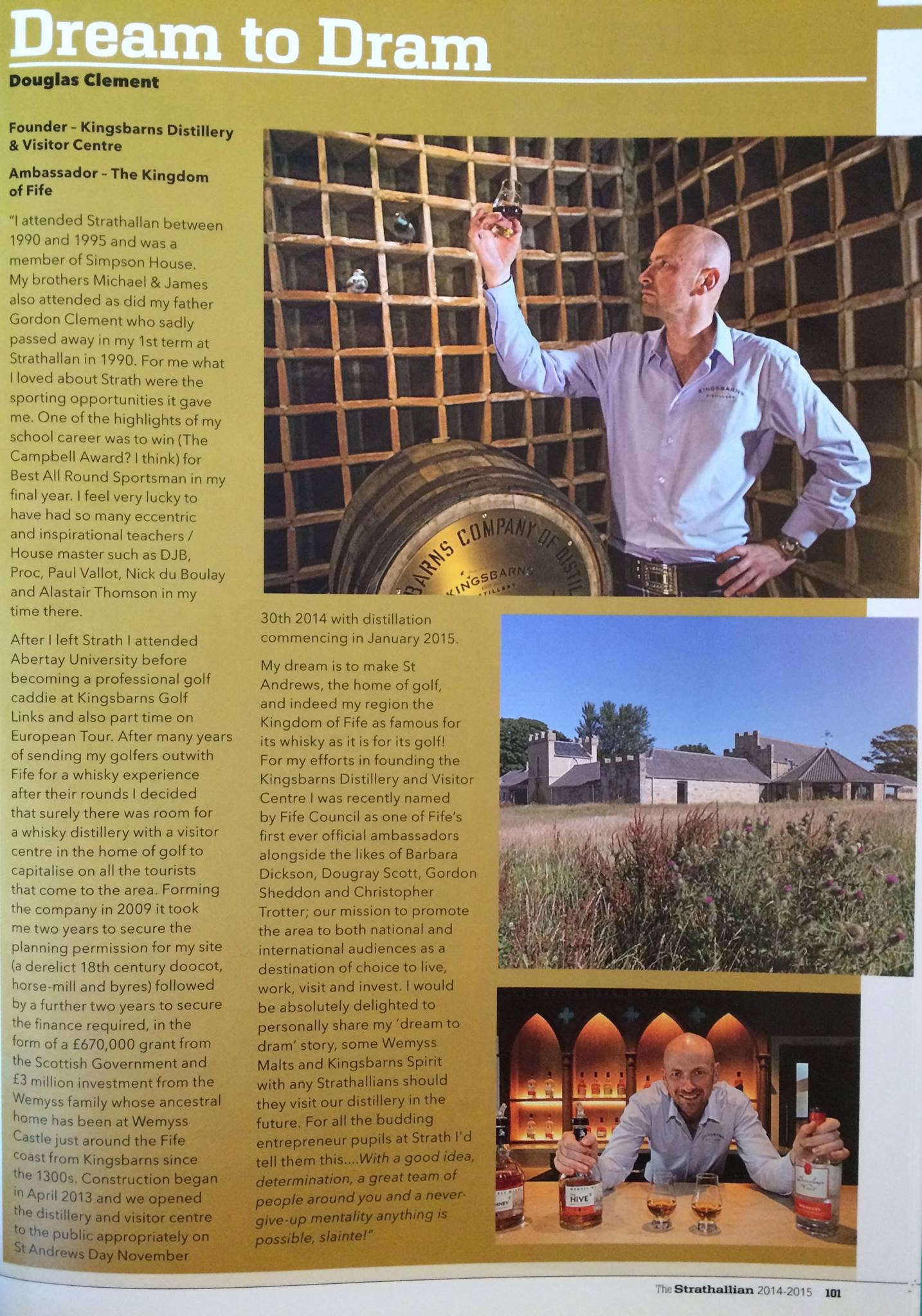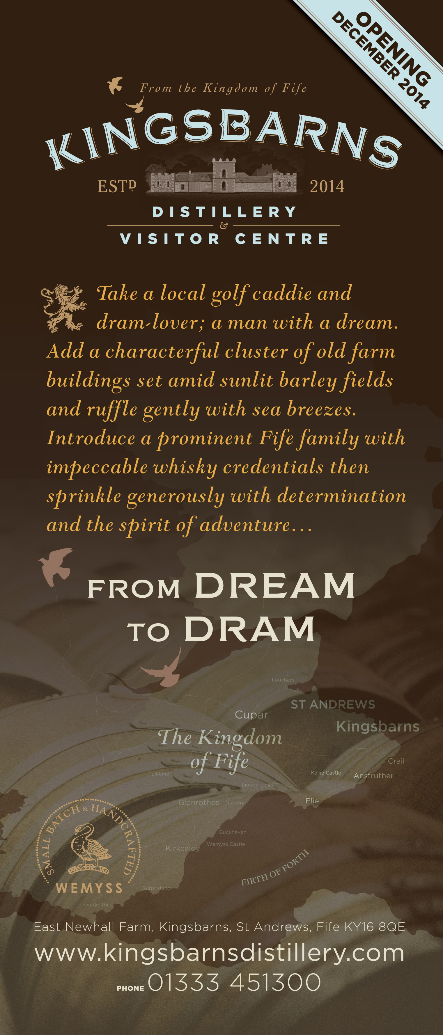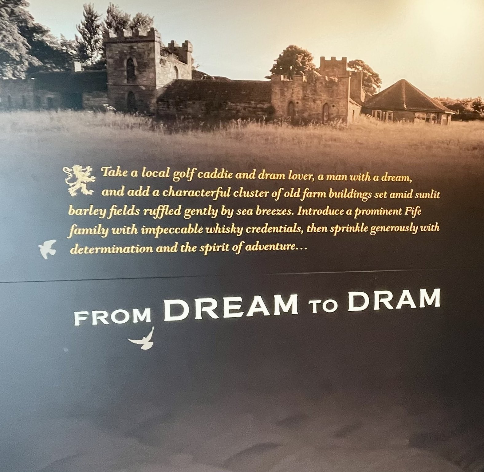 The phrase “Dream to Dram” was conjured up by Jamie Jauncey (the writer Wemyss hired to help with the Kingsbarns brand) in the summer of 2014 just before the distillery opened to describe my journey from golf caddie to distillery founder. So you can imagine how amazing it felt to see this phrase as the first thing that visitors saw in the distillery exhibition at the start of their tour and in a lot of the branding literature. The media seemed to like the phrase too. However for me the ultimate honour was when the first flagship Kingsbarns whisky was named Dream to Dram (now sadly discontinued and replaced by Doocot). To celebrate this I got my first tattoo with Dram to Dram written onto the Glencairn Glass next to the Kingsbarns bottle which made the headlines in the Scotsman newspaper and Whisky Explorer Magazine.
